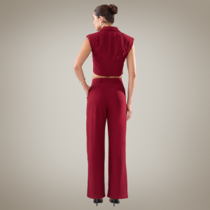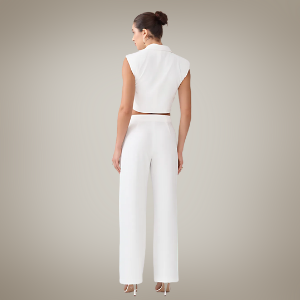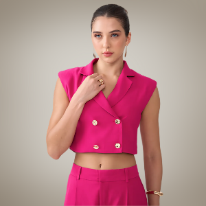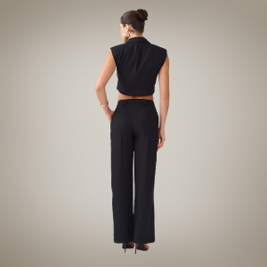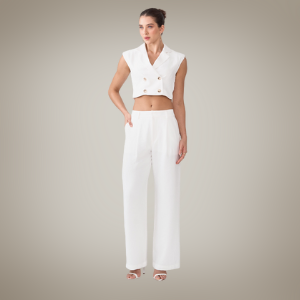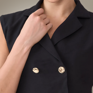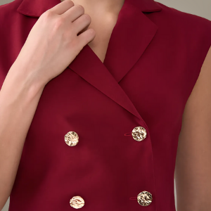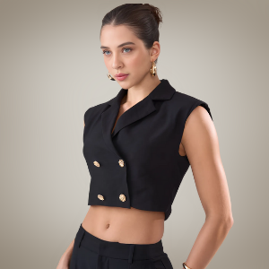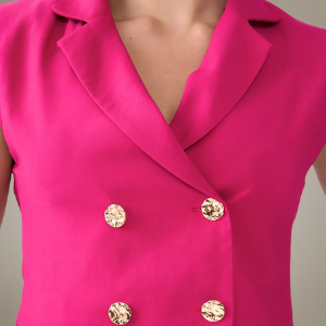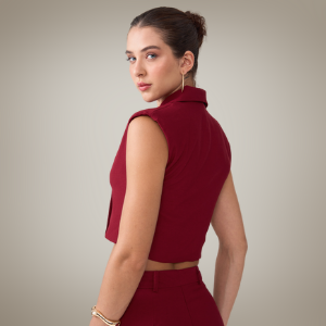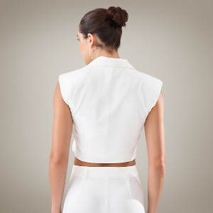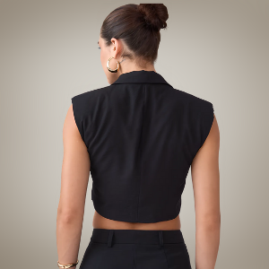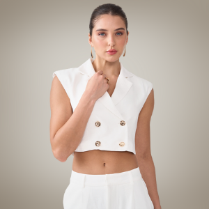 Detalhes do Produto: Colete de alfaiataria, ombros marcados e sobreposição com botões.