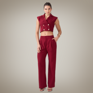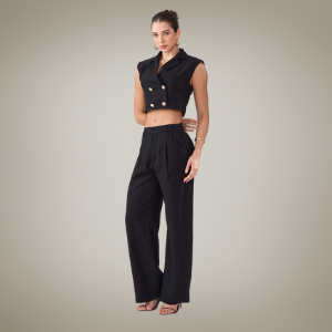 O colete Dyanna é confeccionado em alfaiataria sarjada. A peça possui lapela chanfrada, cavas regulares e decote “V”. Ombros marcados por ombreiras e comprimento cropped. Detalhe de sobreposição frontal com botões chapados de bordas douradas.