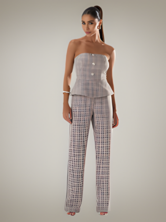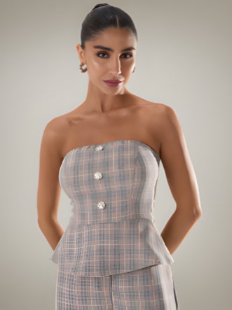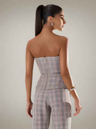 O Corset Samara é confeccionado em alfaiataria, um tecido de gramatura encorpada e textura suave, com pouca elasticidade. A peça apresenta um caimento ajustado ao corpo, valorizando a silhueta de forma elegante. O modelo conta com um decote tomara que caia, estrutura com barbatanas no busto e elástico no decote, garantindo maior sustentação e conforto. A abertura traseira é em zíper de metal, proporcionando praticidade ao vestir.