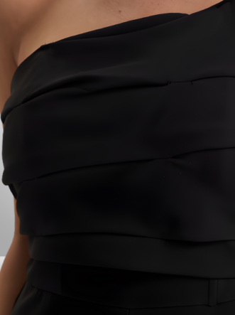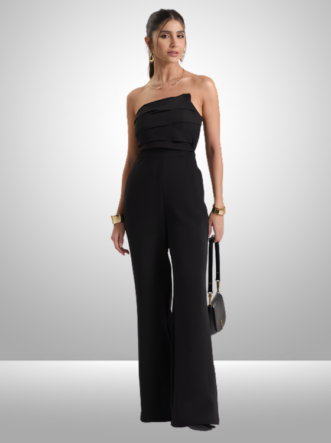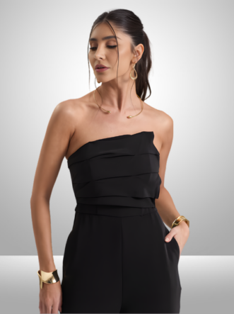 O Macacão Livia é confeccionado em alfaiataria lisa, um tecido de gramatura média que oferece um caimento estruturado e sofisticado. Com elastano em sua composição, proporciona conforto ao vestir, embora mantenha a firmeza característica de um tecido plano. Seu design valoriza a silhueta de forma equilibrada: a parte superior tem um caimento levemente mais justo, destacando o busto com elegância, enquanto a parte inferior é suavemente solta, garantindo liberdade de movimento e um toque de leveza ao visual. O charme fica por conta do decote assimétrico tomara que caia, enriquecido por pregas sobrepostas que adicionam sofisticação à peça. Os bolsos faca trazem praticidade sem comprometer a estética do modelo, e o fechamento com zíper invisível nas costas assegura um acabamento impecável. Características do tecido: Tecido que possui um caimento mais encorpado, possui elastano para proporcionar conforto, porém não é muito flexível por se tratar de um tecido plano de gramatura média. Tem toque liso e suave, não amassa, não é transparente e não marca muito o corpo.