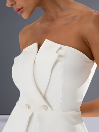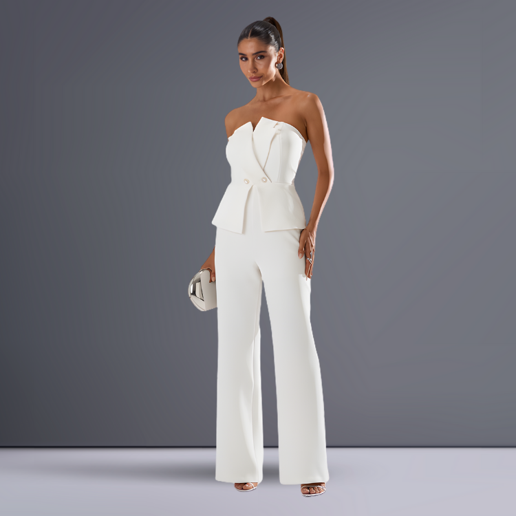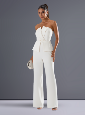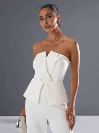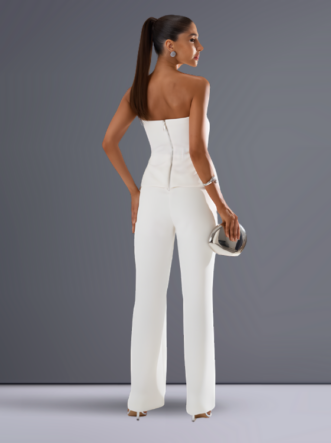 O Macacão Lucy é confeccionado em alfaiataria, um tecido de gramatura encorpada e textura suave, com pouca elasticidade. Sua parte superior tem um caimento firme, enquanto a parte inferior apresenta um caimento mais solto, proporcionando conforto e elegância. O modelo estruturado conta com lapela frontal e decote em V, além de um recorte na cintura que valoriza a silhueta. A barra em evasê adiciona um toque de sofisticação, e a abertura em zíper de metal na parte de trás garante praticidade.