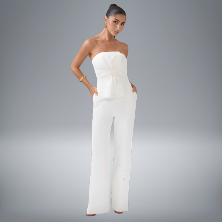 O Macacão Monny é confeccionado em Alfaiataria, um tecido de gramatura encorpada e uma textura suave com pouca elasticidade. Ele possui um caimento mais ajustado na parte superior e mais solto na inferior, realçando a silhueta. O design conta com um elegante decote tomara que caia, complementado por um detalhe de laço frontal. O fechamento em zíper de metal na parte de trás garante praticidade e um acabamento sofisticado.