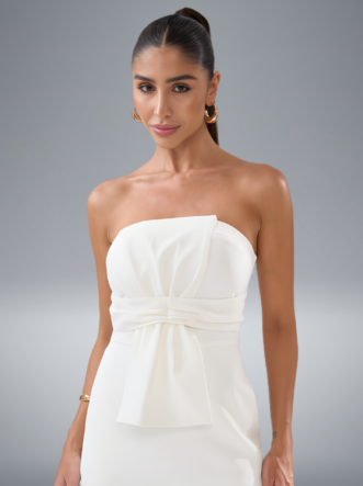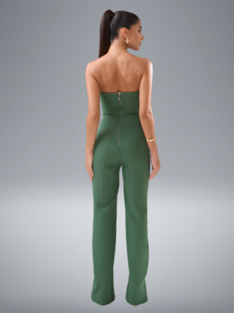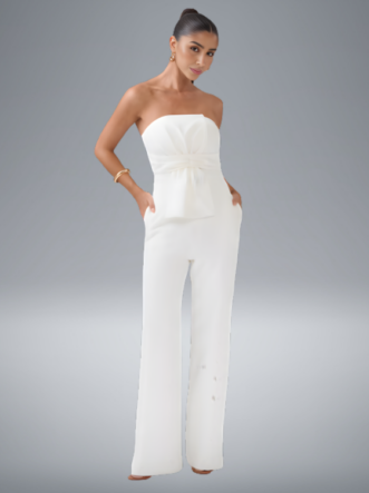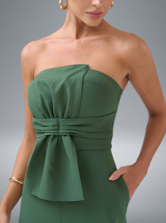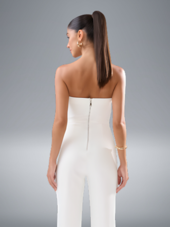 O Macacão Monny é confeccionado em Alfaiataria, um tecido de gramatura encorpada e uma textura suave com pouca elasticidade. Ele possui um caimento mais ajustado na parte superior e mais solto na inferior, realçando a silhueta. O design conta com um elegante decote tomara que caia, complementado por um detalhe de laço frontal. O fechamento em zíper de metal na parte de trás garante praticidade e um acabamento sofisticado.