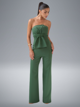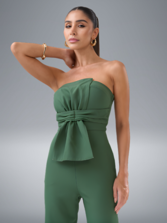Detalhes do Produto: Decote tomara que caia, laço frontal e calça pantalona.