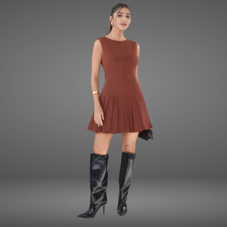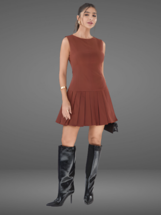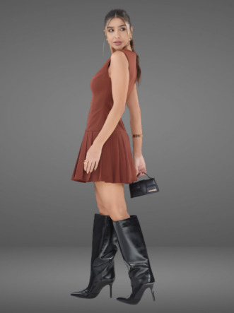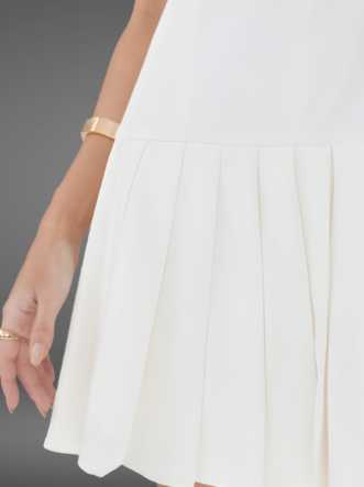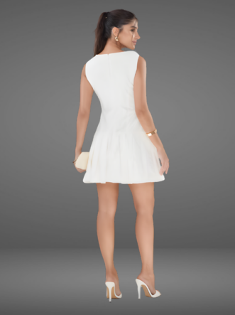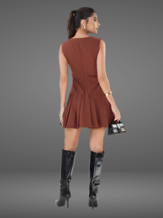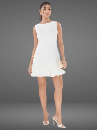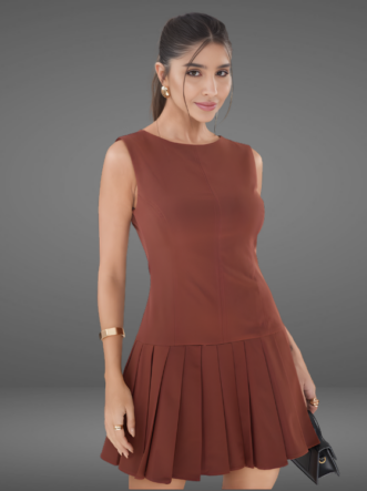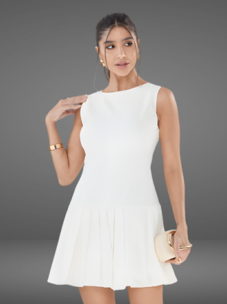 Detalhes do Produto: Sem mangas, modelo curto, pregas e abertura com ziper.