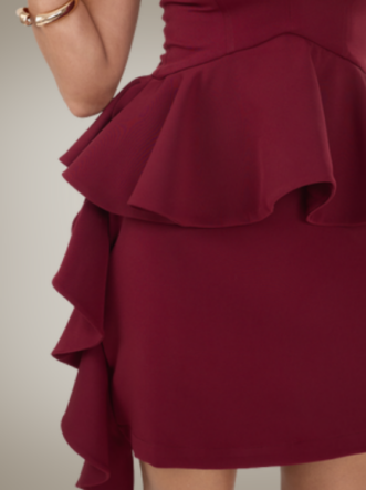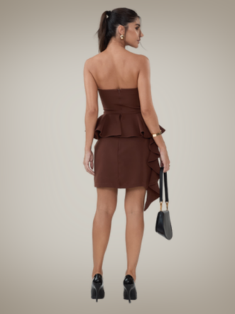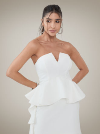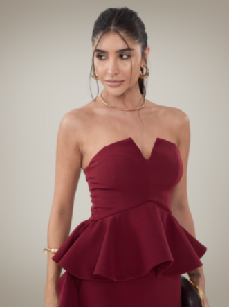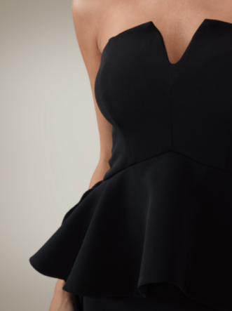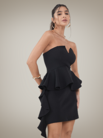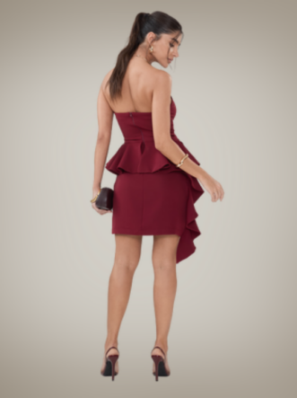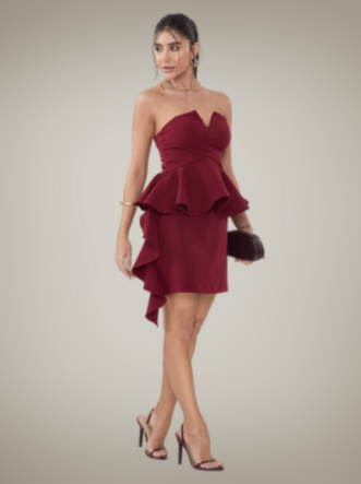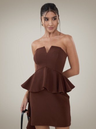 O Vestido Afrodite é confeccionado em alfaiataria um tecido plano com toque encorpado que valoriza o caimento e proporciona um ajuste elegante ao corpo. Com elastano em sua composição, oferece conforto na medida certa, mesmo não sendo altamente flexível. Seu design tomara que caia é realçado pelo decote em V e pela estrutura com barbatanas, que garantem sustentação e segurança ao vestir. Apresenta um delicado babado sobreposto, conferindo movimento e sofisticação ao visual. O fechamento em zíper nas costas proporciona praticidade.