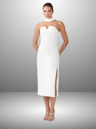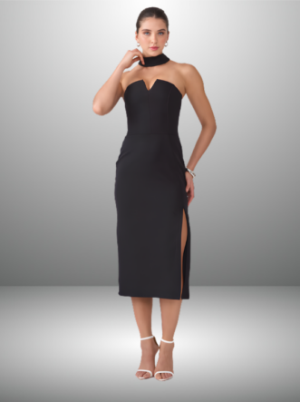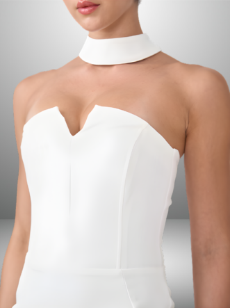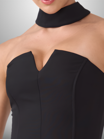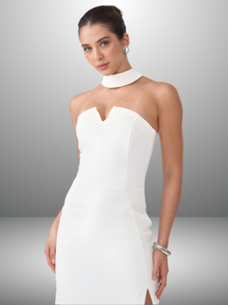 Detalhes do Produto: Tomara que caia,  estrutura em barbatana, fenda na lateral e gola Chocker.