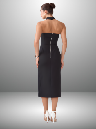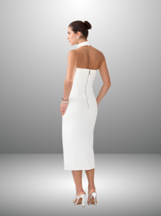 O Vestido Danielle é confeccionado em alfaiataria, um tecido de gramatura encorpada e textura suave, que oferece um caimento refinado com pouca elasticidade. A peça apresenta uma silhueta justa na parte superior e solta na parte inferior, com modelagem longa e elegante decote tomara que caia. Estruturado com barbatanas para um suporte ideal, o vestido também conta com uma gola chocker. Uma fenda lateral e a abertura com zíper invisível na parte de trás completam o design, conferindo praticidade e sofisticação.