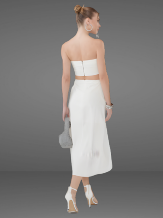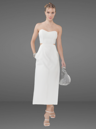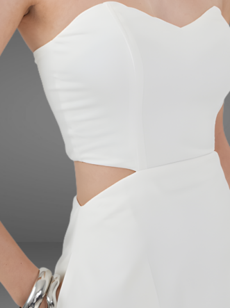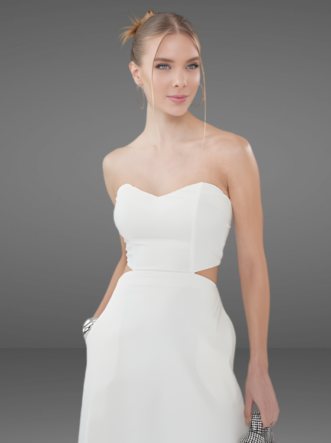 O vestido Jussara é confeccionado em tricoline, um tecido de textura suave e agradável ao toque, com pouca elasticidade. A peça apresenta um elegante decote tomara que caia e conta com barbatanas que proporcionam uma ótima estrutura. O design inclui um recorte cut out e uma saia ampla, complementada por bolsos laterais. O fechamento em zíper na parte de trás garante praticidade e um acabamento sofisticado.