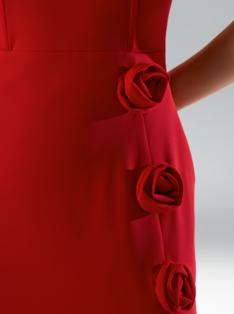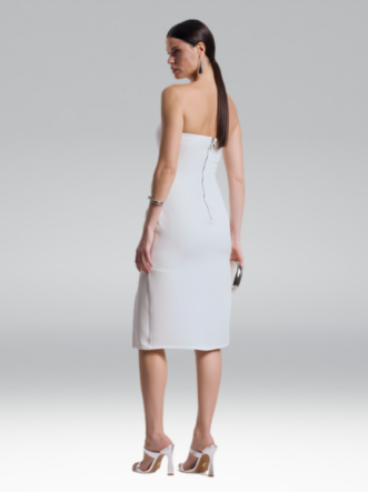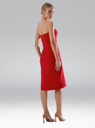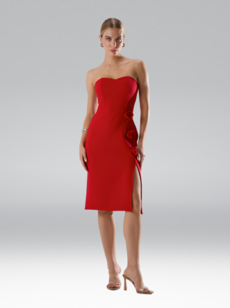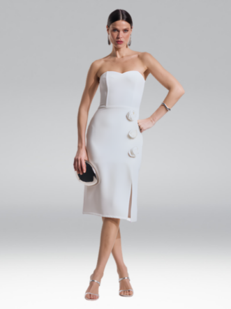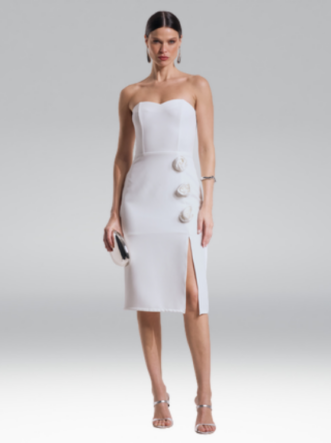O Vestido Karolline é confeccionado em Alfaiataria, um tecido de gramatura encorpada e uma textura suave com pouca elasticidade.Com um caimento ajustado ao corpo, apresenta um elegante modelo tomara que caia, estruturado por barbatanas que garantem suporte. O comprimento midi é realçado por uma fenda lateral adornada com delicados detalhes de flores. A abertura em zíper de metal na parte de trás assegura praticidade e um toque sofisticado.