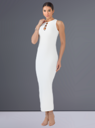 O Vestido Laila é confeccionado em malha, um tecido leve, respirável e com excelente elasticidade, que proporciona conforto e um caimento impecável. Com modelagem ajustada ao corpo, valoriza a silhueta de forma elegante. O comprimento midi é realçado por um moderno recorte vazado na parte frontal e aviamento diferenciado, conferindo sofisticação à peça. Conta ainda com abertura em zíper nas costas e uma fenda na saia, que garante charme e liberdade de movimento.