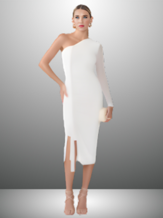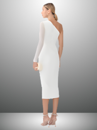 O Vestido Lavinia é confeccionado em tule, um tecido leve, com excelente elasticidade e uma delicada transparência. Seu caimento valoriza a silhueta de forma elegante, criando um visual sofisticado e refinado. Com modelo midi, o vestido destaca-se pelo decote assimétrico, a manga longa e os detalhes drapeados, que adicionam um toque de glamour. A amarração funcional na lateral e a abertura em zíper nas costas oferecem praticidade e um ajuste perfeito.