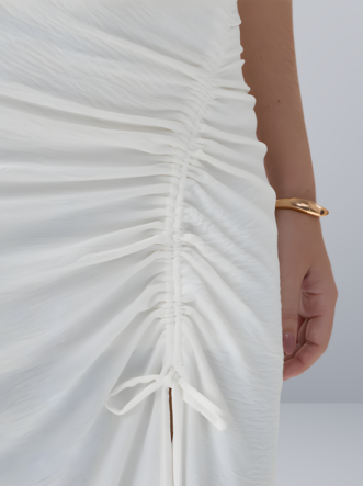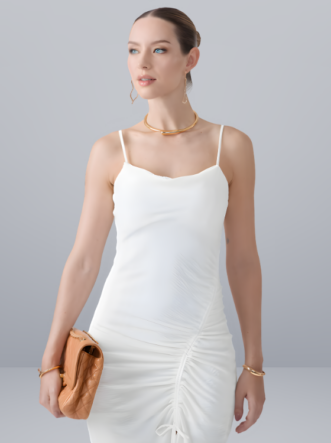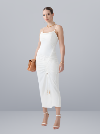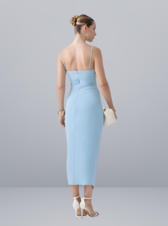 O Vestido Loren é confeccionado em crepe, um tecido de textura enrugada com um toque suave e macio. Embora tenha pouca elasticidade, seu caimento é leve e elegante, adaptando-se perfeitamente ao corpo. Este modelo apresenta um decote degage, alças finas com regulagem e uma fenda lateral ajustável com detalhe de ponteira em metal. O fechamento posterior é feito por um zíper invisível, garantindo um ajuste discreto e sofisticado.