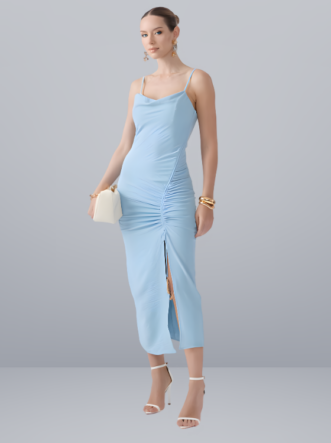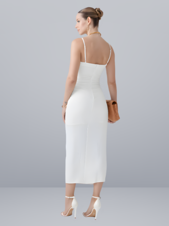 Detalhes do Produto: Decote degagê, vestido Midi e fenda ajustável.