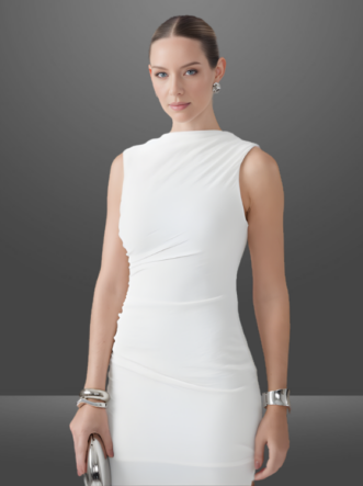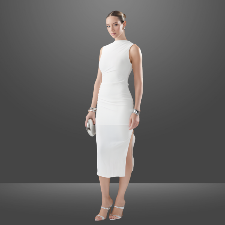 O Vestido Lucy é confeccionado em crepe, um tecido de textura levemente enrugada que proporciona um toque suave e macio, com pouca elasticidade. Com um caimento justo ao corpo, essa peça midi apresenta uma gola alta e detalhes franzidos que realçam a silhueta. Conta ainda com uma fenda lateral e uma abertura com zíper invisível na parte de trás, combinando elegância e praticidade.