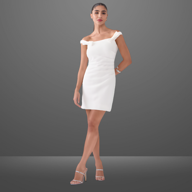 O Vestido Ludmilla é confeccionado em alfaiataria, um tecido de gramatura encorpada e uma textura suave com pouca elasticidade. Seu caimento valoriza a silhueta de maneira elegante e moderna. O modelo ombro a ombro é realçado por pregas nas laterais e laço 3D na altura do ombro trazendo charme a peça. Abertura em zíper de metal na parte de trás do produto, garantindo praticidade e sofisticação.