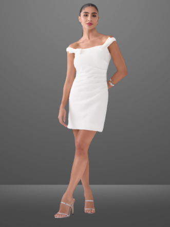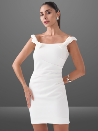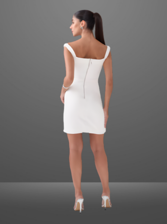 O Vestido Ludmilla é confeccionado em alfaiataria, um tecido de gramatura encorpada e uma textura suave com pouca elasticidade. Seu caimento valoriza a silhueta de maneira elegante e moderna. O modelo ombro a ombro é realçado por pregas nas laterais e laço 3D na altura do ombro trazendo charme a peça. Abertura em zíper de metal na parte de trás do produto, garantindo praticidade e sofisticação.