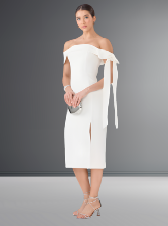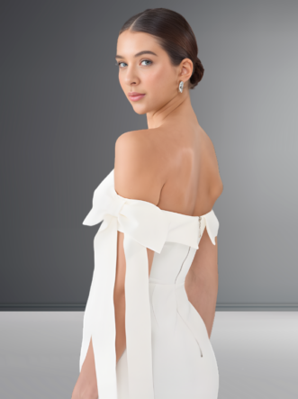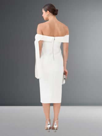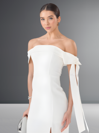O Vestido Malva é confeccionado em alfaiataria, um tecido de gramatura encorpada e uma textura suave com pouca elasticidade. A peça tem um caimento justo, que realça a silhueta com sofisticação. Seu design midi apresenta um decote ombro a ombro, complementado por um laço fixo nas mangas. A fenda frontal e a abertura em zíper nas costas adicionam um toque de charme e praticidade ao modelo.