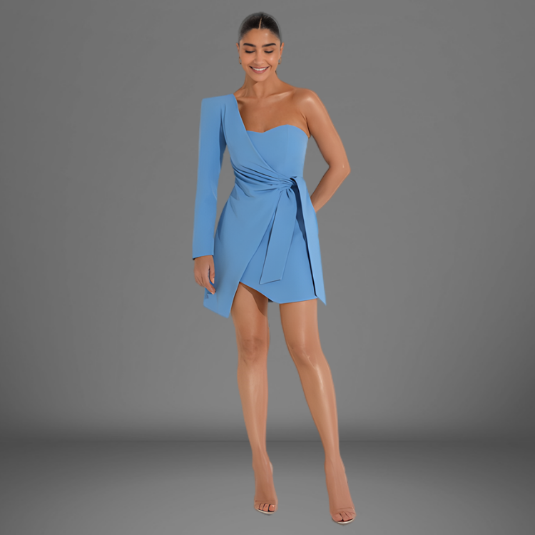 O Vestido Michelle é confeccionado em Alfaiataria, apresenta um modelo curto, assimétrico com transpasse frontal e uma manga com ombreira, abertura em zíper na parte de trás do produto.