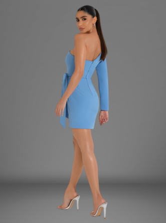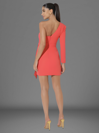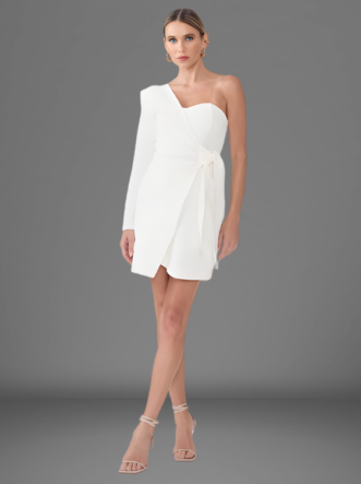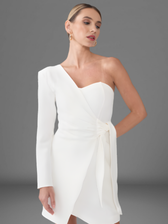 O Vestido Michelle é confeccionado em Alfaiataria, apresenta um modelo curto, assimétrico com transpasse frontal e uma manga com ombreira, abertura em zíper na parte de trás do produto.