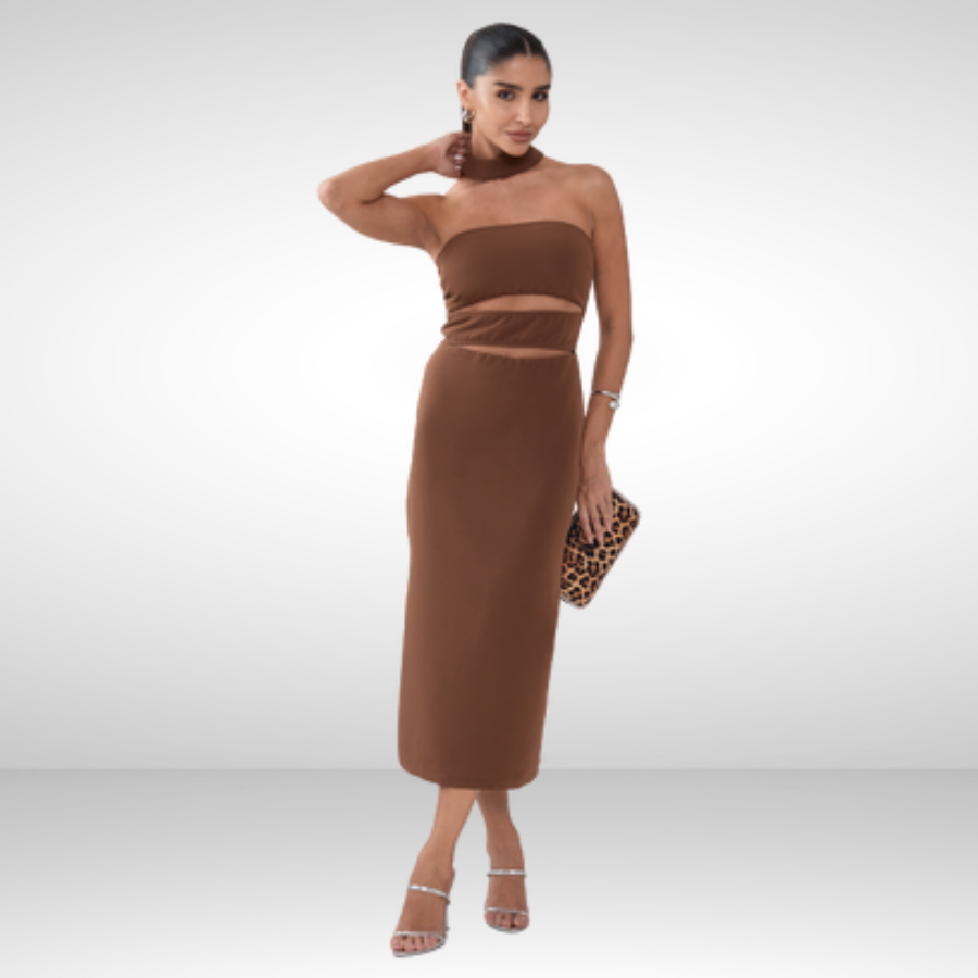 O Vestido Paola é confeccionado em alfaiataria, com tecido de gramatura encorpada e textura suave, que proporciona um toque confortável e sofisticado. Sua modelagem apresenta um caimento justo na parte superior, valorizando a silhueta, enquanto a parte inferior é solta, garantindo liberdade de movimento. O modelo Tomara que caia traz recortes frontais que adicionam um toque de elegância e modernidade à peça. O vestido possui abertura em zíper nas costas, facilitando o ajuste.