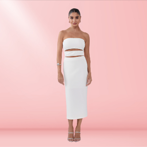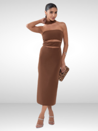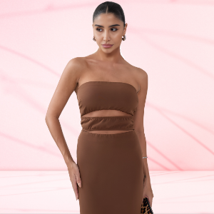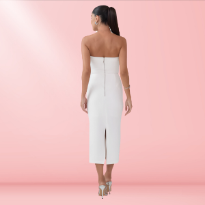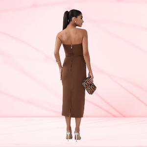 O Vestido Paola é confeccionado em alfaiataria, com tecido de gramatura encorpada e textura suave, que proporciona um toque confortável e sofisticado. Sua modelagem apresenta um caimento justo na parte superior, valorizando a silhueta, enquanto a parte inferior é solta, garantindo liberdade de movimento. O modelo Tomara que caia traz recortes frontais que adicionam um toque de elegância e modernidade à peça. O vestido possui abertura em zíper nas costas, facilitando o ajuste.