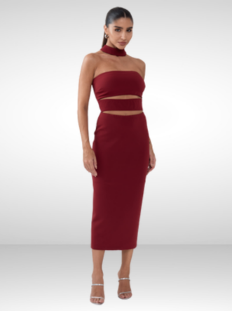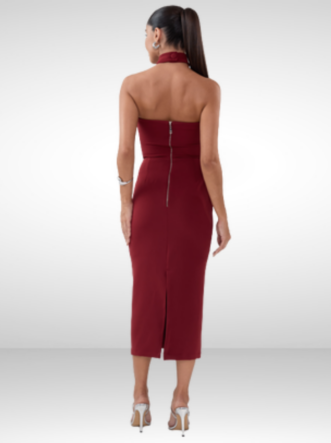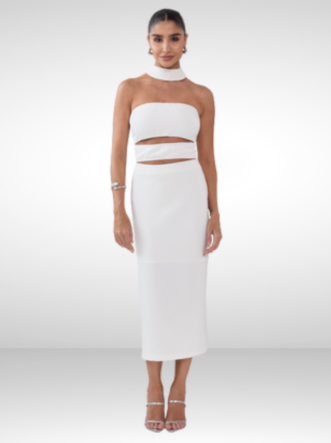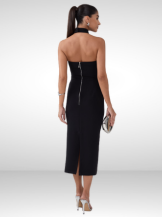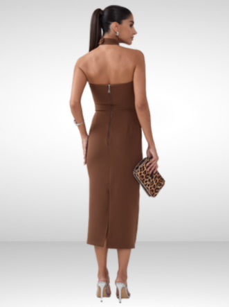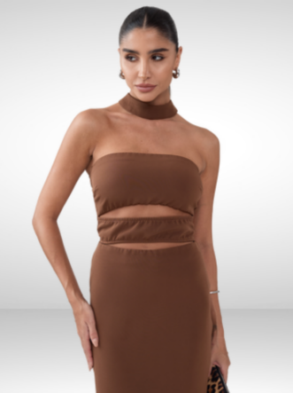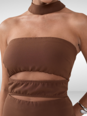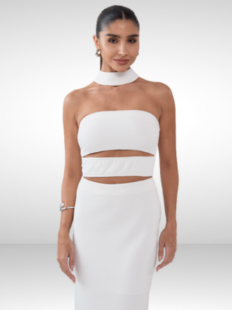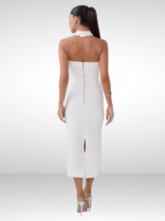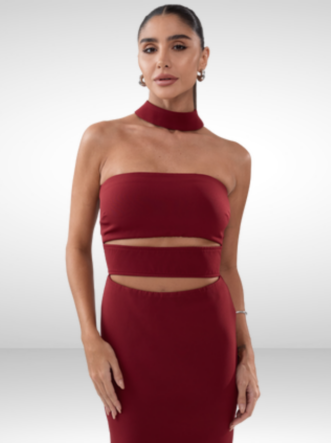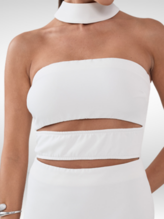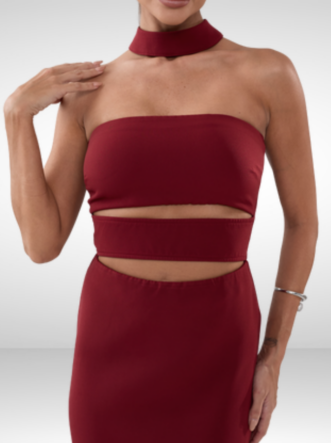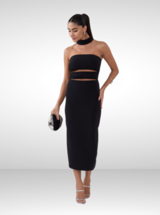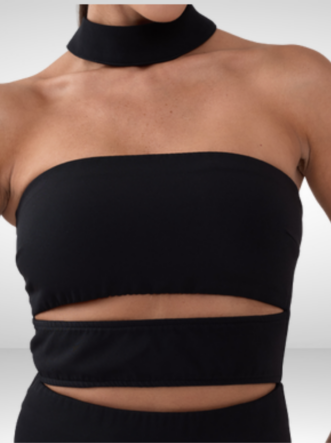 Detalhes do Produto: Recorte frontal, tomara que caia, gola chocker, fenda e abertura em zíper.