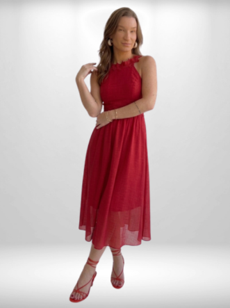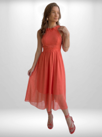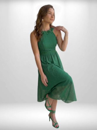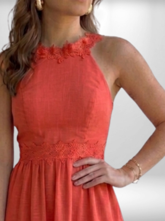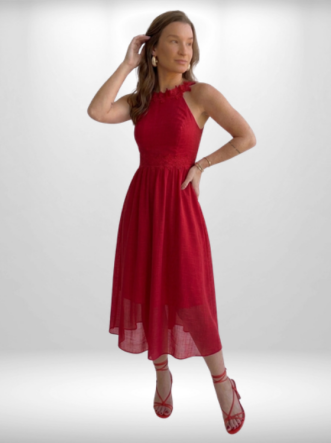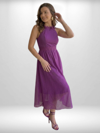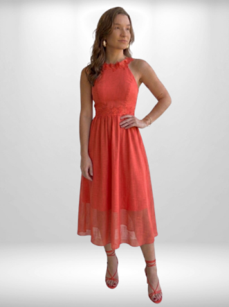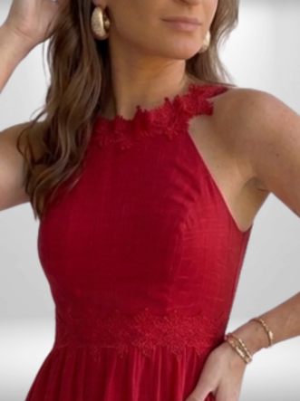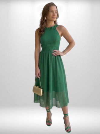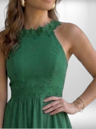 Design Exclusivo: O decote halter (frente única) valoriza os ombros e alonga a silhueta, trazendo um ar moderno e refinado. Riqueza nos Detalhes: O acabamento em renda guipir no pescoço e na cintura cria um ponto de luz artesanal, definindo o corpo com delicadeza e elegância. Movimento Irresistível: A saia de corte fluido com leve transparência na barra proporciona um movimento gracioso a cada passo, ideal para eventos sociais, festas de gala ou jantares especiais. Conforto Premium: Forrado para garantir total segurança e com um caimento que abraça as curvas de forma suave.