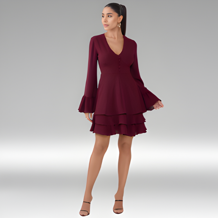 O Vestido Sheyla é confeccionado em crepe, um tecido plano de gramatura fina, leve e com toque suavemente enrugado, característico de sua textura elegante. Com um caimento fluido e delicado, o modelo proporciona conforto e liberdade de movimento, ideal para quem valoriza leveza e sofisticação no dia a dia. Sua transparência sutil adiciona charme ao visual, enquanto o decote em V alonga a silhueta. O abotoamento forrado fixo confere um acabamento refinado, e os delicados babados aplicados nas mangas e na barra da saia trazem um toque moderno à peça.