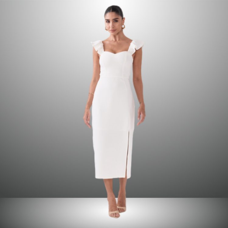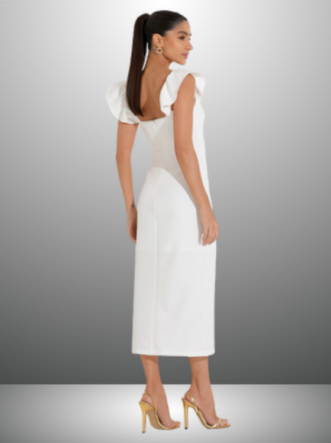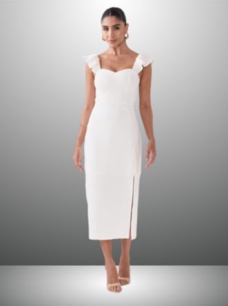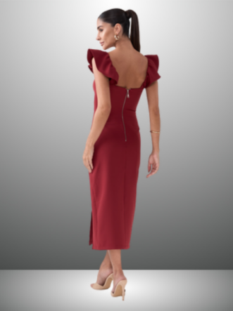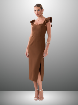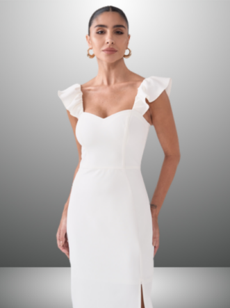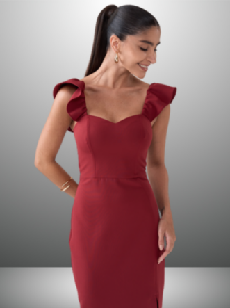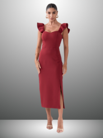 Detalhes do Produto: Alças com babados, comprimento Midi e fenda lateral.