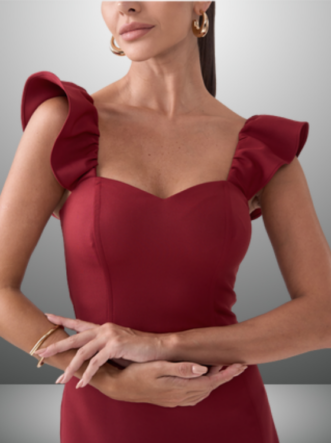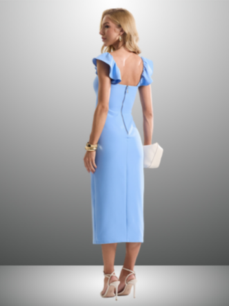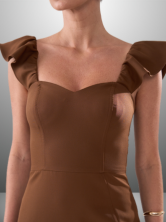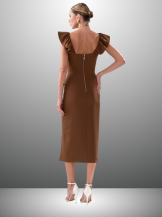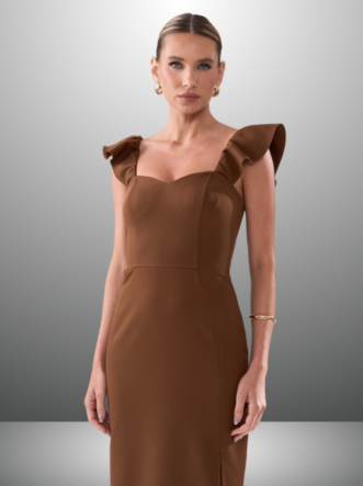 O Vestido Solange é confeccionado em Alfaiataria, um tecido de gramatura encorpada e uma textura suave com pouca elasticidade. Este modelo apresenta um caimento solto e comprimento midi, além de uma elegante fenda lateral. As alças são adornadas com delicados babados, e a peça conta com uma abertura em zíper invisível na parte de trás, garantindo um ótimo ajuste.