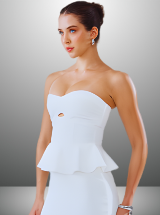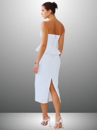 O Vestido Zarah é confeccionado em Alfaiataria, um tecido de gramatura encorpada e textura suave, com pouca elasticidade. A peça apresenta um caimento ajustado, valorizando o corpo de forma elegante. O modelo midi possui um decote tomara que caia e estrutura de barbatana para melhor sustentação, além de um delicado vazado no centro do busto. A parte superior conta com um detalhe peplum, enquanto a parte de trás traz uma fenda e um zíper de metal, garantindo sofisticação e praticidade.